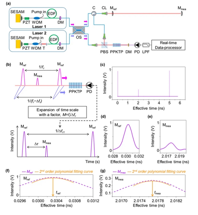 作者们提出了一种使用两台不同重复频率飞秒激光的绝对长距离测量方法。该方法能在良好天气条件下露天测量约648米的距离,精度达到2.05微米。所开发的设备具有良好的应用潜力,并可扩展至12公里的无模糊测量范围。