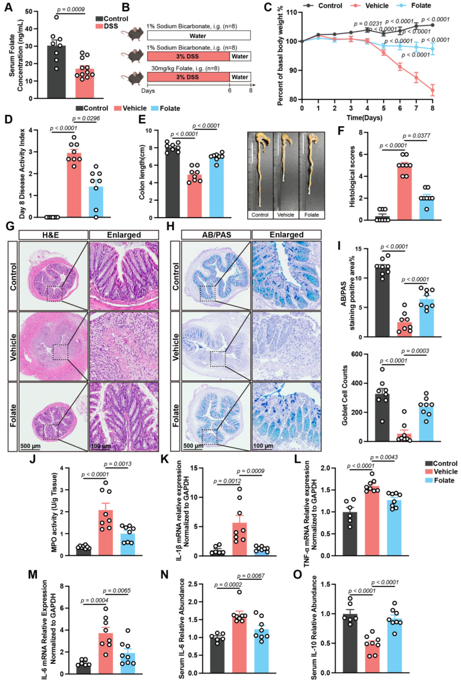 •验证治疗效果:在实验模型中观察外源性补充叶酸是否能减轻结肠炎的症状(如体重减轻、结肠缩短、组织损伤)。