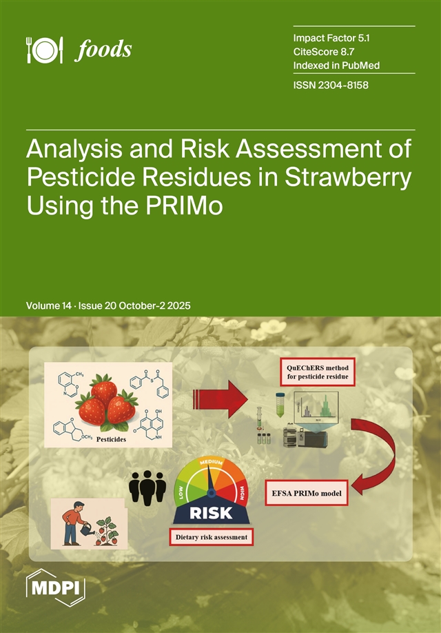 De Rosa, E.; Di Lillo, M.; Triassi, M.; Di Duca, F.; Russo, I.; Graziano, V.; Mazzei, G.; Gentile, I.; Shojaeian, S.Z.; Montuori, P. Analysis and Risk Assessment of Pesticide Residues in Strawberry Using the PRIMo Model: Detection, Public Health and Safety Implications.Foods2025, 14, 3470.https://doi.org/10.3390/foods14203470