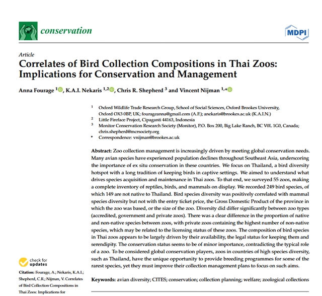 动物园的动物收藏管理越来越受到全球保护需求的驱动。东南亚许多鸟类物种的种群数量都在下降,凸显了在这些国家开展迁地保护的重要性。本研究的目标是了解泰国动物园物种引进和维护的驱动因素。