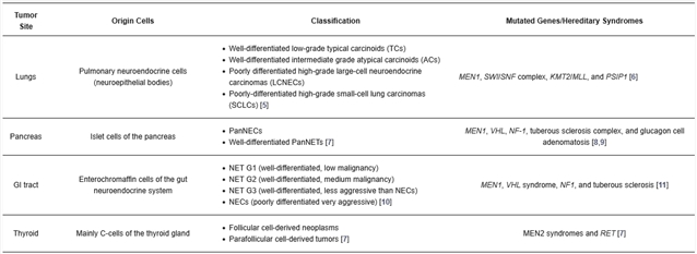 表1. 神经内分泌肿瘤类型、WHO分级标准及其与遗传综合征/基因突变的关联