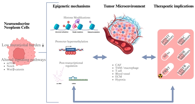 图1. 神经内分泌肿瘤中表观遗传机制与肿瘤微环境之间的相互作用示意图。