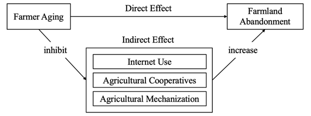 研究将“农户耕地撂荒面积”作为被解释变量,以“人口老龄化”为解释变量,用“家庭老年人口比例”来衡量老龄化程度。为了更严谨地揭示因果关系,研究采用了适用于分析受限因变量的Tobit模型作为主要分析工具,并综合运用Logit、Probit模型进行稳健性检验。研究还引入了中介效应模型,从信息获取 (互联网使用)、互助合作 (农业合作社) 和要素替代 (农业机械化) 三个理论视角,检验潜在的作用路径 (图1)。