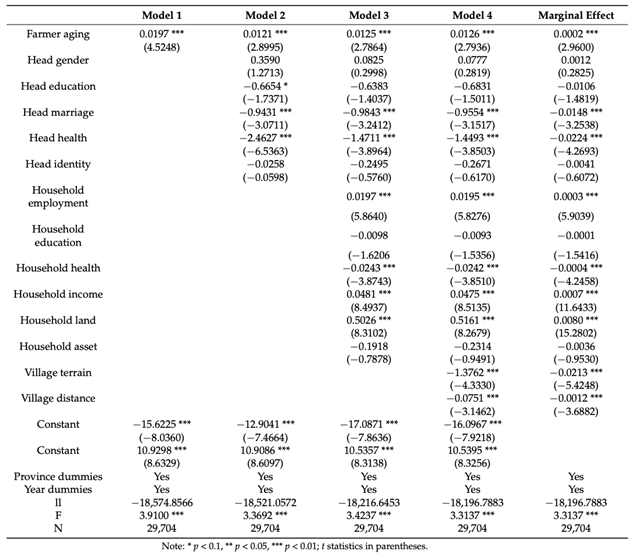 分析结果表明 (图2),农村老龄化程度与耕地撂荒之间存在显著的正向关系。即农户家庭中老年人口比例越高,其耕地撂荒的面积也越广。这一结论在纳入户主特征 (如婚姻、健康)、家庭特征 (如非农就业占比、健康、非农收入占比、土地规模) 和村庄特征 (如地形、区位) 等多项控制变量后,依然稳健成立。