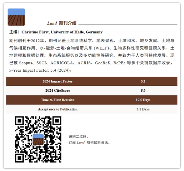 期刊创刊于2012年,期刊涵盖土地系统科学、地表景观、土壤和水、城乡发展、土地与气候相互作用、水-能源-土地-食物纽带关系 (WELF)、生物多样性研究和健康关系、土地建模和数据处理、生态系统服务以及多功能性等研究,并致力于人类可持续发展。现已被 Scopus、SSCI、AGRICOLA、AGRIS、GeoRef、RePEc 等多个关键数据库收录,5-Year Impact Factor: 3.4 (2024)。