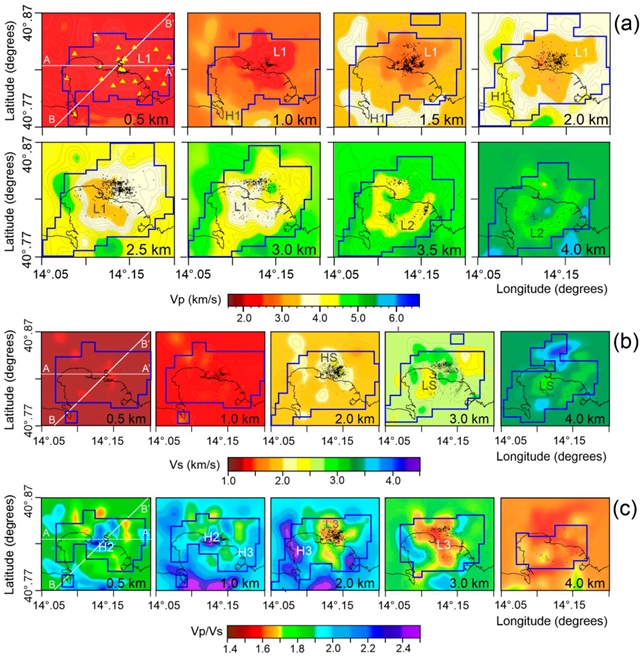 图2.Vp(a)、Vs(b)和Vp/Vs(c)模型最终解的分布图。图中描绘了各层±0.25km范围内的重新定位的三维地震(黑色圆圈)。S表示索尔法塔拉地区。蓝色实线标出了分辨率较高的区域。