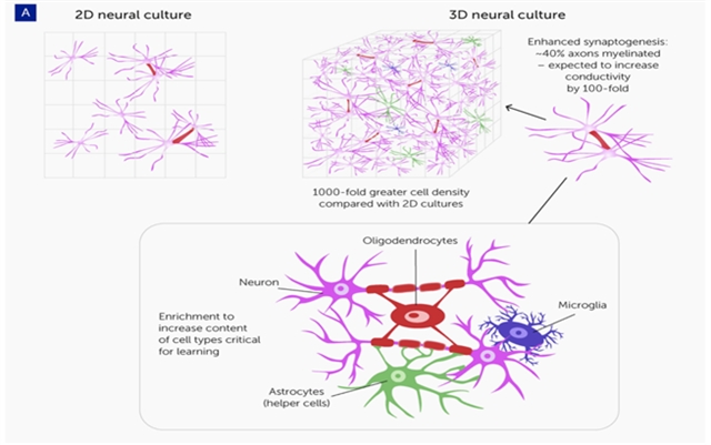 图1 3D 细胞培养技术的进步为探索类器官智能提供了基础。与传统的 2D 单层培养相比,3D 神经细胞培养在生物学习方面具有重要优势——即细胞密度远更高、突触生成增强、髓鞘化水平高,以及富含对学习至关重要的细胞类型(Source of the picture: Smirnova L, Caffo BS, et al. Organoid intelligence (OI): the new frontier in biocomputing and intelligence-in-a-dish. Front Sci (2023) 1:1017235. doi: 10.3389/fsci.2023.1017235. Licensed under CC BY 4.0.)
