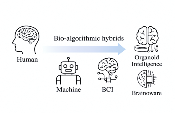 大脑类器官,这种由人类多能干细胞衍生的 3D 脑模型,正在迅速从单一的实验室工具演变为一个新兴跨学科领域——类器官智能(OI)。随着 3D 培养与神经接口技术进步(图1),以及 Brainoware 等生物计算系统的出现,研究者已将大脑类器官嵌入计算电路并通过 BCI 实现信号交互,使其在训练中表现出可塑性并执行语音识别等任务。由此,我们正从“人/机”二元走向“生物—算法混合体”(图2)。然而,当神经组织呈现更复杂的电生理活动与信息处理迹象时,关于“潜在意识”、道德地位与跨物种嵌合体边界的争论随之上升;更棘手的是,材料来源、使用权与处置/销毁等基础义务也被迫重新定义,传统伦理框架已难以单独覆盖这些叠加风险。