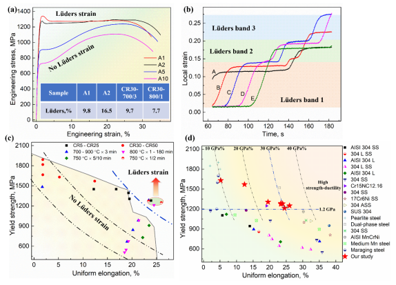 在单轴拉伸试验中,应力-应变曲线表现出一种特殊的屈服行为:流变应力并非平稳上升,而是出现突然转变,伴随着特征性的屈服降落(即不连续屈服),随后吕德斯带开始扩展(即屈服点伸长)。通常认为,吕德斯带的扩展(或吕德斯应变)是一种不好现象,它不仅会在构件表面产生条带状褶皱等缺陷,还会加速塑性失稳并降低塑性。然而,近期研究表明,具有较大吕德斯应变的金属材料仍能协同实现高强度-韧性。这种优异的力学性能分别被归因于相变诱导塑性效应、层状异质与相变诱导塑性的结合、异质变形以及高密度位错等机制。遗憾的是,吕德斯应变在变形行为及韧化机制中所扮演的角色尚未阐明。