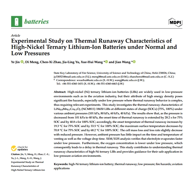 高镍三元锂离子电池在常压和低压下的热失控特性实验研究