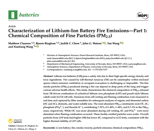 本研究旨在表征圆柱形磷酸铁锂(LFP)和软包钴酸锂(LCO)电池在热失控燃烧过程中释放的PM2.5的化学成分。