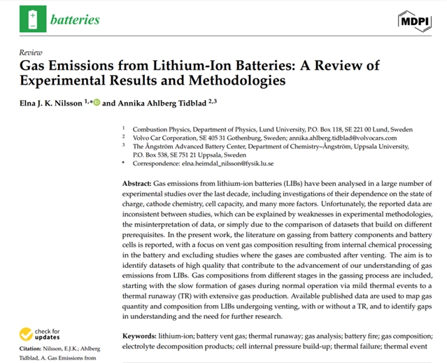 这篇综述总结了关于电池组件和电池单元气体释放的文献,重点是电池内部化学处理产生的排气成分,包括正常运行期间缓慢形成气体以及大量产气的热失控。