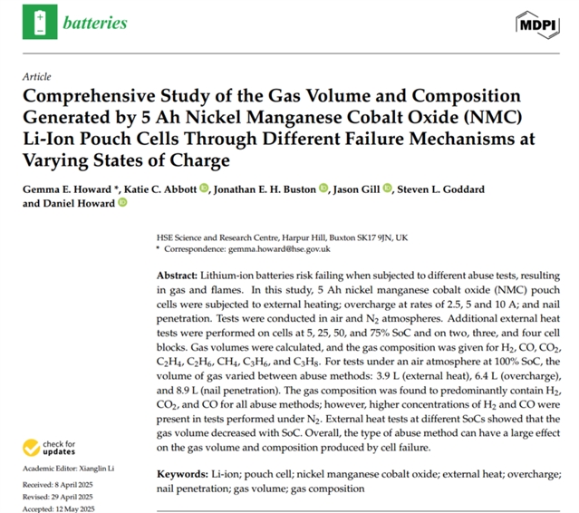 本文探究了镍锰钴氧化物(NMC)袋式电池在不同测试条件下进行外部热测试,并分析了不同测试气氛下释放气体的组成和浓度。