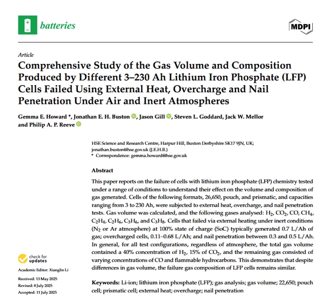 本文报道了在一系列条件下测试磷酸铁锂(LFP)电池的失效情况,对各种LFP电池规格、容量和制造商的故障产生的气体体积和成分进行了验证分析。