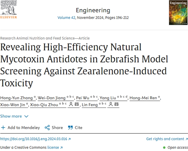 | 四川农业大学团队基于斑马鱼模型发现高效天然霉菌毒素解毒剂 Engineering |