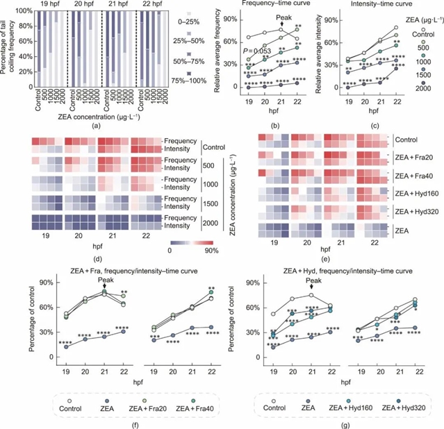 为进一步验证其功效,研究团队采用TCMacro方法对斑马鱼胚胎的自发运动进行量化分析。结果显示,ZEA暴露显著降低了胚胎尾部卷曲频率和强度,而秦皮素处理可将这些指标恢复至接近正常水平,表现出良好的体内解毒活性。相比之下,羟基酪醇虽有一定缓解作用,但整体效果不及秦皮素。