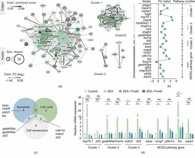 转录组分析显示,ZEA处理导致斑马鱼胚胎中超过500个mRNA表达发生变化,涉及细胞凋亡、细胞周期、细胞衰老等多个生物学过程。通过构建蛋白-蛋白互作网络,研究人员识别出79个差异表达基因构成关键子网络,其中p53为核心枢纽基因。秦皮素处理可显著逆转ZEA诱导的p53过表达,并下调多个与凋亡、周期阻滞和衰老相关的基因表达,提示其通过调控p53和FoxO信号通路发挥解毒作用。