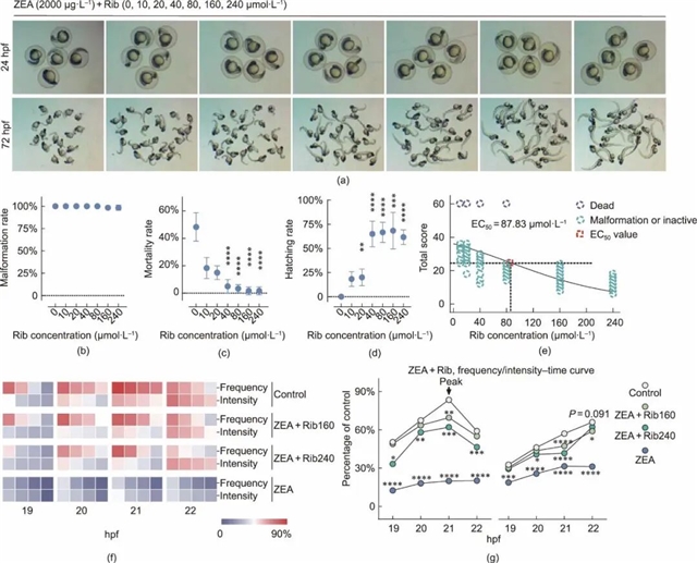此外,研究还利用CMap数据库对ZEA毒性相关基因表达特征进行比对,预测出可能逆转毒性通路的天然产物。通过斑马鱼模型二次筛选,进一步验证了牛奶树碱、瑞香素和核黄素等化合物的解毒潜力。其中,核黄素虽表现出一定缓解效果,但其EC50值为87.83 μmol·L-1,仍低于秦皮素。