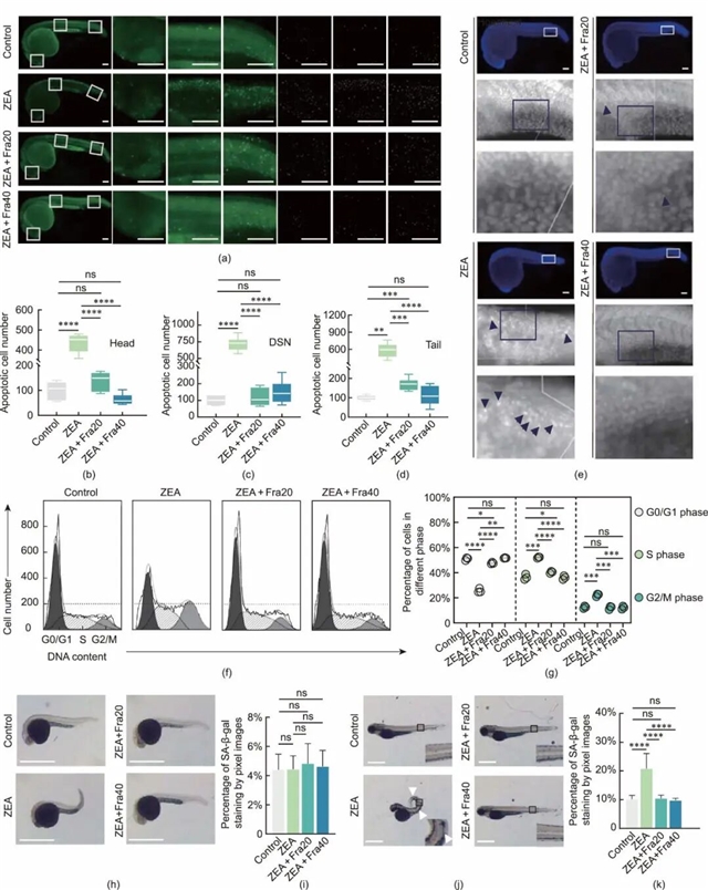 图6 秦皮素明显抑制ZEA诱导的细胞凋亡、G2期阻滞和细胞衰老。