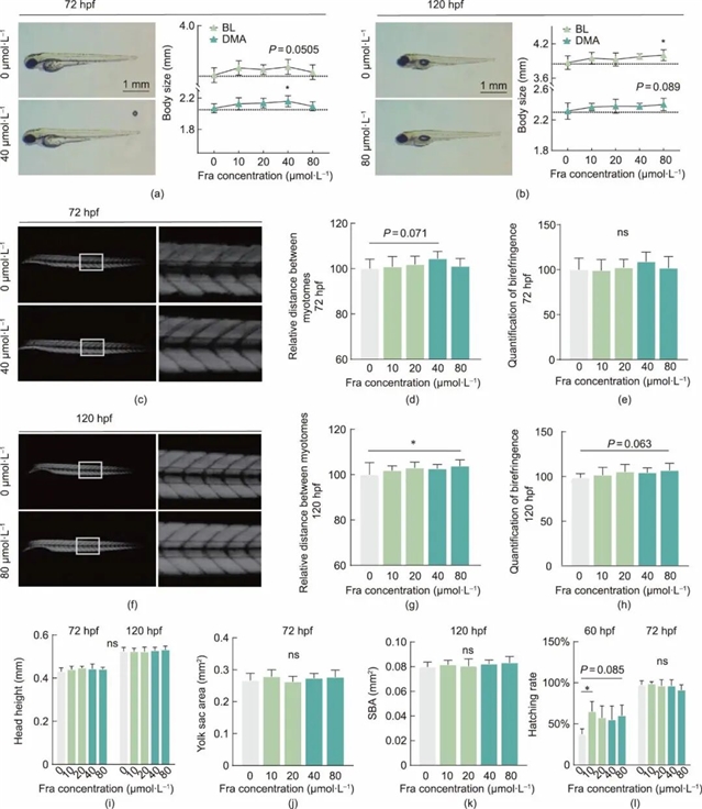 研究发现,秦皮素在单独使用时还可促进斑马鱼胚胎的生长,表现为体长、肌节间距和肌肉双折射强度的增加,且在测试浓度范围内未观察到毒性反应,显示出良好的安全性。
