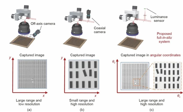 图2. (a) 基于离轴相机的方案示意图,该方案在平面坐标系中捕获大范围低分辨率图像。(b) 基于同轴相机的方案示意图,该方案在平面坐标系中捕获小范围高分辨率图像。(c) 本文提出方案的示意图,该方案在角坐标系中采集图像,同时支持大范围与高分辨率成像。