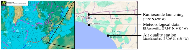 作者选取2023年11月的韦尔瓦作为研究对象,该期间大气以稳定高压为主,出现了NO2浓度偏高的情况。研究利用气象探空气球数据,每天两次的垂直大气剖面资料,包括温度和湿度等指标,通过三种不同方法估算行星边界层高度:理查森数法、湿度梯度和折射率梯度。各方法输出的边界层高度值分别与ERA-5大气再分析数据进行对比分析,以评估不同方法在不同大气条件下的适用性。研究还结合天气系统分析解释边界层高度的时间变化,并分析了探空资料估算的边界层高度与马塔拉斯卡尼亚斯(Matalascañas)本底监测站的NO?浓度之间的相关关系。