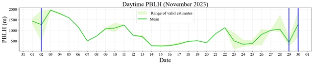 2023 年 11 月的白天边界层高度。不透明线代表根据世界协调时间 12 点的无线电探空仪计算出的估计值的平均值,且仅使用被视为有效的数值;透明阴影代表被视为有效的估计值范围,即被视为有效的最低和最高边界层高度之间的范围。蓝色线条代表从行星边界层高度(PBLH)估计中排除的日子。