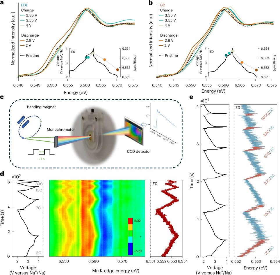 为了进一步理解高倍率条件下的反应动力学,研究团队利用同步辐射开展了原位超快X射线吸收谱实验。该实验采用的超快X射线吸收谱技术结合特制模具,可在约1秒时间尺度内获得完整吸收谱,从而实时追踪充放电过程中过渡金属价态的变化。实验结果表明,即使在约100C的高倍率条件下,Mn K-edge仍表现出清晰且可逆的变化,说明电池容量主要来源于体相Mn的法拉第氧化还原反应。