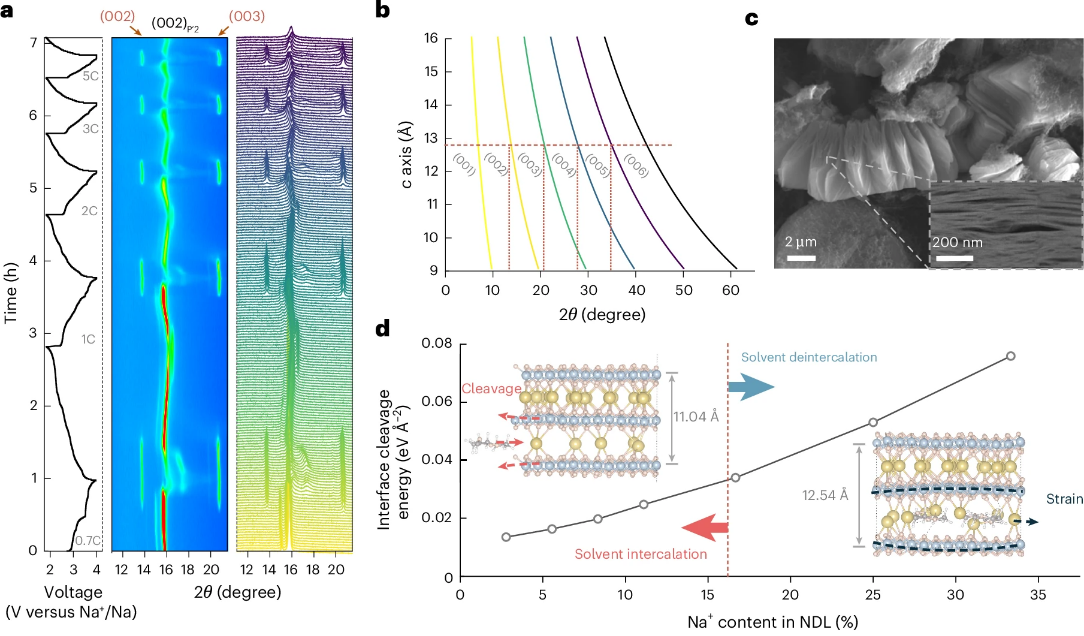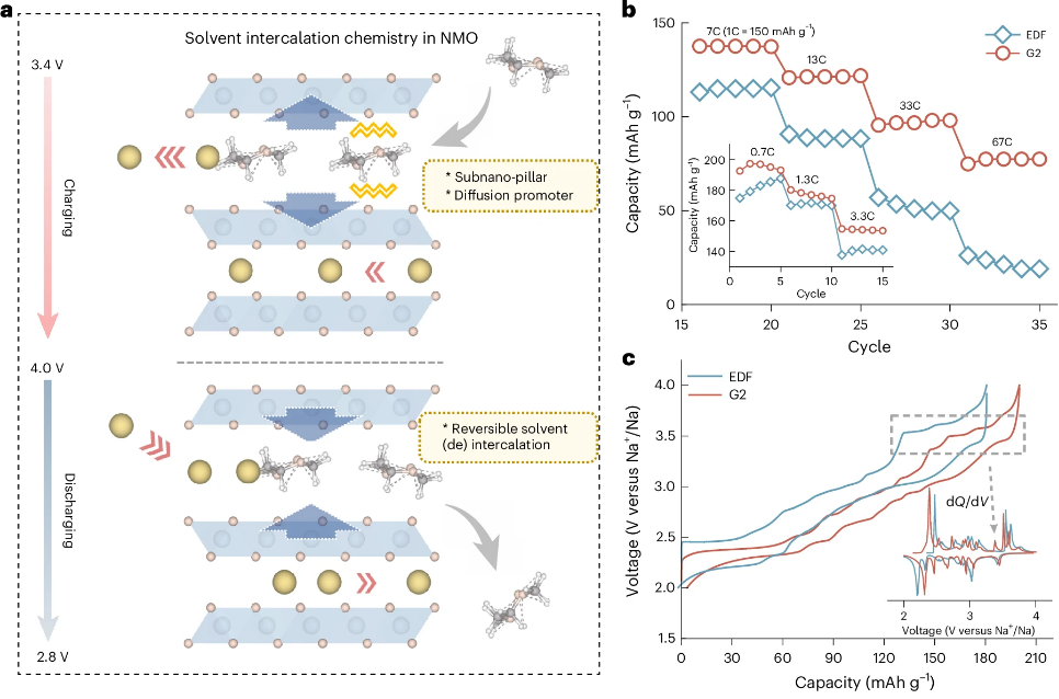 该研究表明,在层状氧化物正极中,电解液溶剂在特定条件下可以参与可逆电化学嵌入/脱出过程,这为理解高倍率条件下的电极反应机制提供了新的视角,也为通过电极材料与电解液协同设计提升钠离子电池快充性能提供了新的研究思路。