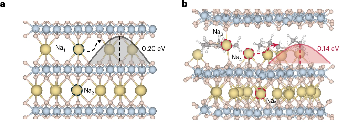 此外,研究团队结合第一性原理计算计算,对溶剂分子嵌入层状结构后的离子迁移行为进行了分析。计算结果表明,溶剂分子进入层间空间后能够调节层间结构环境,并降低Na+迁移的能量,从而有利于提升离子扩散动力学。这一理论结果与实验观测结果相一致,为理解溶剂参与插层反应的动力学机制提供了重要的理论依据。