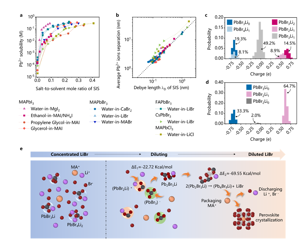 图2:“高盐电解液”合成钙钛矿的机理。a,Pb2+溶解度随“高盐电解液”中盐/溶剂摩尔比的增加而显著提升。b,Pb2+离子间距与德拜长度呈线性关系,证实屏蔽效应的作用。c-e,分子动力学模拟显示,浓SIS中为分散的中性团簇(c),稀释后形成带电团簇并聚集结晶(d,e)。