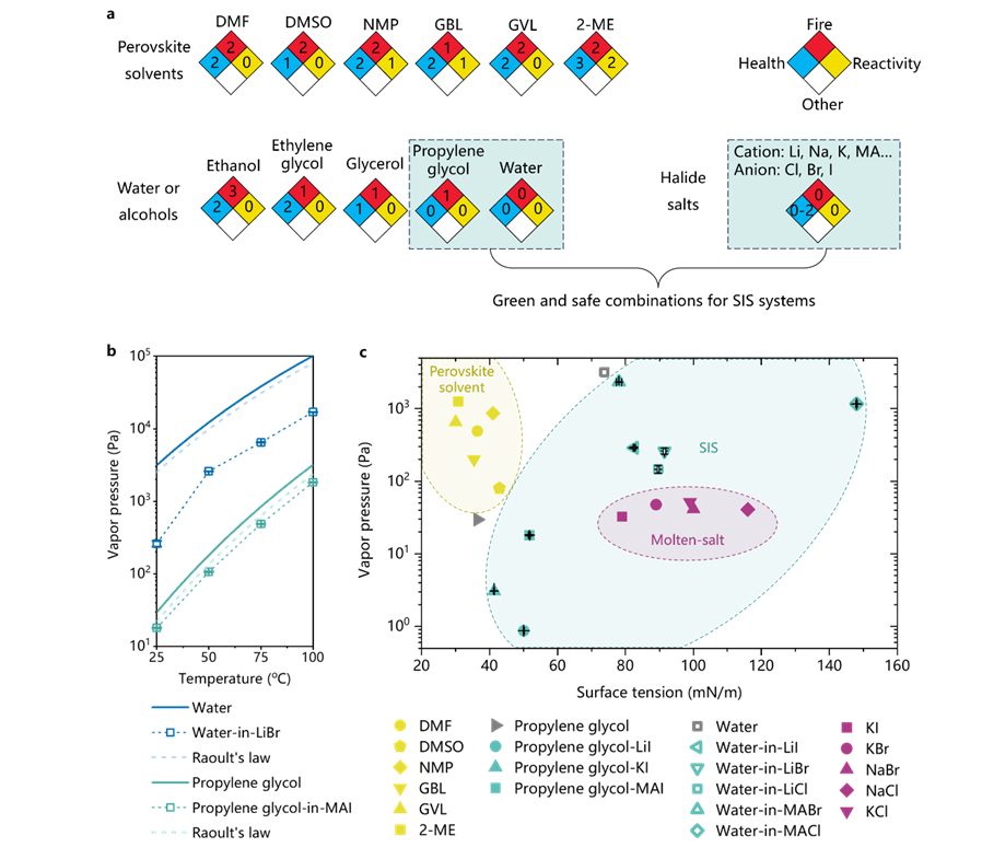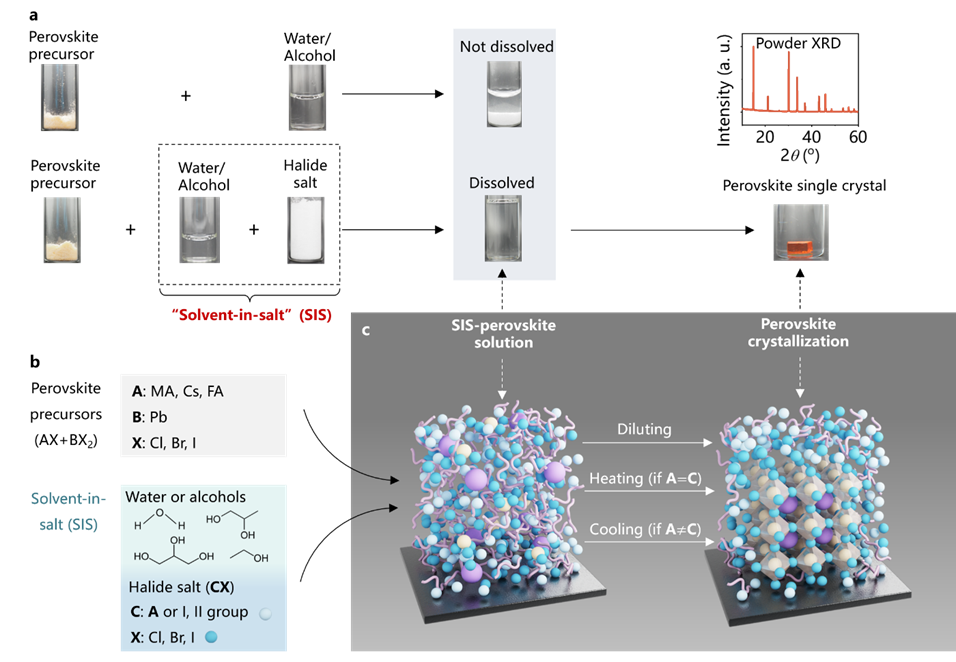 研究发现,当把大量的卤盐(如溴化锂、碘化锂等)溶解在少量的水或醇中,形成一种“高盐电解液”的浓盐溶液时,这种混合体系竟然能够溶解钙钛矿前驱体。在这一体系中,盐才是真正的“溶剂”,而水或醇实际上扮演了“反溶剂”的角色(稀释会导致钙钛矿析出)。这一发现彻底打破了对传统有毒有机溶剂的依赖。