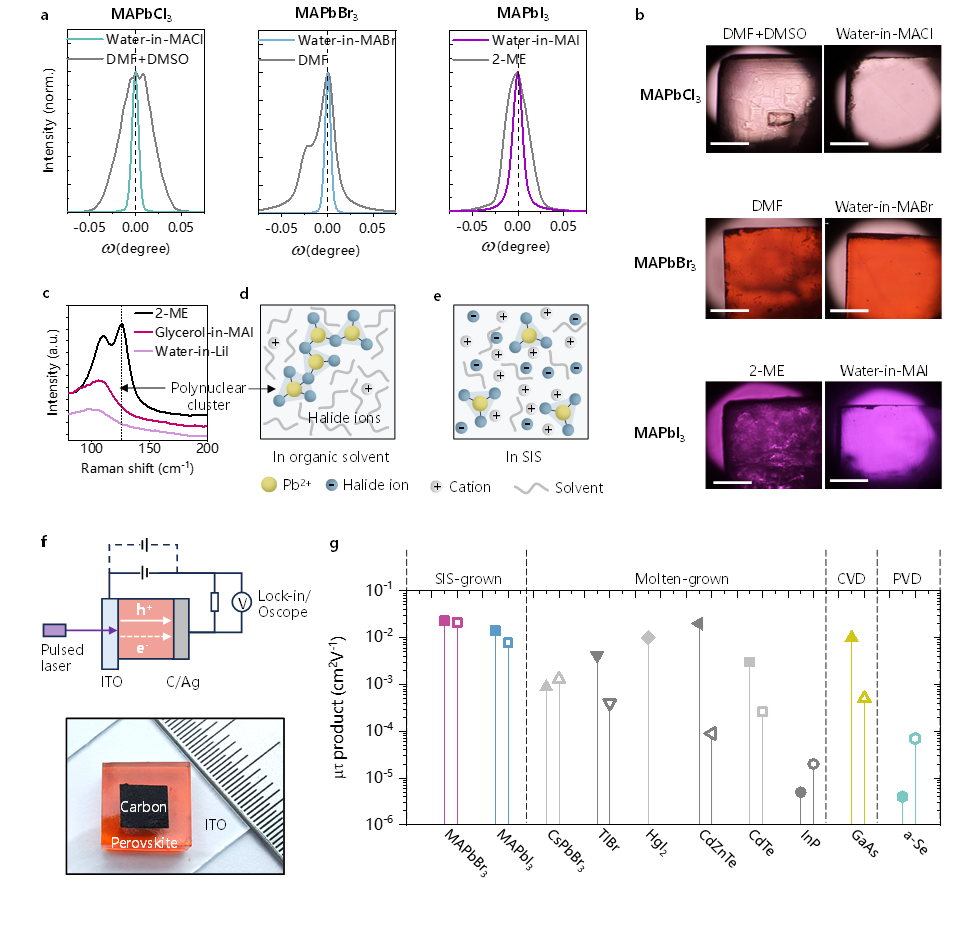 图3:“高盐电解液”生长的钙钛矿单晶表征。a,b,SIS生长的晶体具有更窄的X射线摇摆曲线和更均匀的光学显微图像,表明结晶质量更高。c,拉曼光谱显示SIS溶液中多核团簇被抑制。g,SIS生长的单晶实现了创纪录的高迁移率-寿命乘积(μτ),媲美无机半导体。