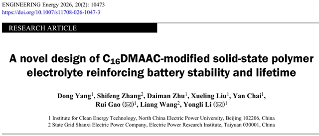 Dong Yang, Shifeng Zhang, Daiman Zhu, Xueling Liu, Yan Chai, Rui Gao, Liang Wang, Yongli Li. A novel design of C16DMAAC-modified solid-state polymer electrolyte reinforcing battery stability and lifetime. ENG.Energy, 2026, 20(2): 10473 DOI:10.1007/s11708-026-1047-3