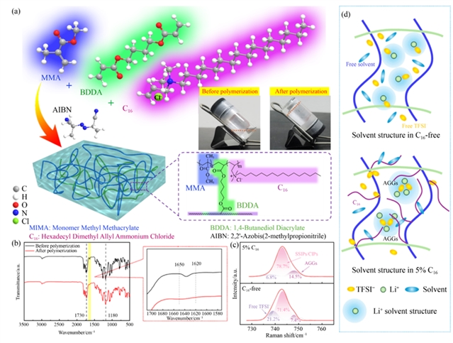 图1展示MMA、BDDA和C16DMAAC的自由基聚合过程。FTIR证实经过原位热聚合后,单体完全转化,季铵盐成功接枝于主链。拉曼光谱则证实引入C16DMAAC 能调控Li+溶剂化结构,提升电解质中AGGs比例。
