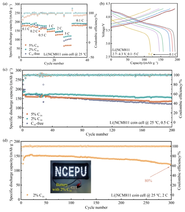 图4显示了该GPE在实际电池体系中的应用情况。NCM811全电池倍率性能显示2% C16样品在大倍率5 C条件下仍保持119.1 mAh/g的容量,且电池表现出了良好的循环性能,0.5 C下200次循环后容量可达172.2 mAh/g,容量保持率92%;高倍率2 C和5 C下300次循环后分别容量保持率分别为80%和76%。