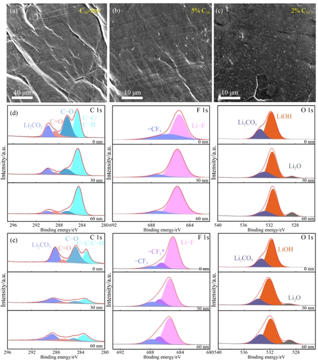 图5为反应后金属负极的微观结构变化。SEM与XPS深度剖析证实2% C16样品的SEI内层以Li2CO3等无机组分为主,有机C–C/C–H信号随刻蚀深度显著降低;而无C16和5% C16样品SEI富含有机物,且5% C16样品CF2峰更显著,表明TFSI-分解更严重。无机相为主导的表面更有利于获得长的循环寿命。