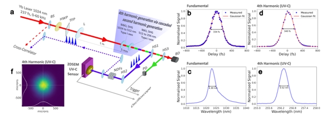 研究人员首先展示了UV-C飞秒激光源与半导体传感器的集成示意图(图1a)。飞秒UV- C脉冲是通过在非线性晶体中对1024 nm激光器级联二次谐波(SHG)产生256 nm的四次谐波(FH)得到。该激光器(基频光)的脉冲持续时间为236 fs,FWHM为4.3 nm(图1b和1c)。后续,研究人员计算了互相关轨迹与UV-C脉冲光谱来测量脉冲的持续时间243 fs,FWHM为0.52 nm(如图1d和1e)。