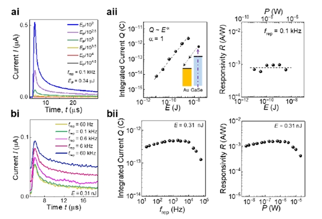 接下来,研究人员首先研究GaSe对飞秒UV-C激光脉冲的探测。在真空环境下进行了不同脉冲能量(图3ai)以及重复频率(图3bi)下的电脉冲。结果显示Q值随E线性增加且响应度R在不同E下保持恒定(图3aii)。另外,在固定E的情况下,随着f_rep的增加,Q值和R值大致保持恒定,但在高f_rep时会下降(图3bii)。