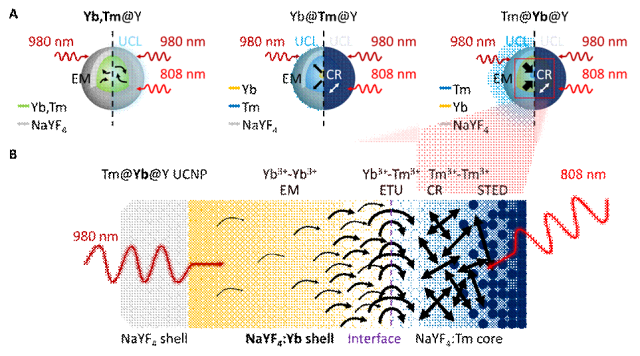 (A) 不同核壳结构 UCNPs 的发光对比示意图。(B) 通过空间排布与界面耦合实现的能量定向传递与发光增强原理示意图。