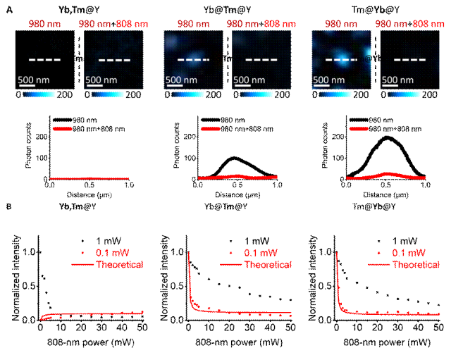 (A) 图中展示了三种 UCNPs 在单光束 (980 nm) 与双光束 (980 nm + 808 nm) 照射下的发光效果。(B) 图中展示了三种 UCNPs 在 980 nm激光功率为 0.1 mW 和 1 mW 激发下的发光抑制效果对比,并通过理论模拟验证了 0.1 mW 激发时的发光抑制效果。其中,808 nm 的抑制光功率在 0 到 50 mW之间调节。