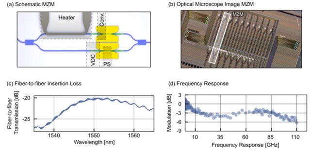 C波段MZM调制器采用SiN多模干涉仪实现光信号的分束与合束,两臂集成等离子体移相器及光子-等离子体转换器(图2a、b)。测试结果显示,调制器在1550 nm 处光纤插入损耗为 -20.3 dB(图2c);频率响应在 10-110 GHz 范围内仅 3 dB 衰减(图2d)。表征证实,MZM 调制器可实现 256 GBd 的最高符号速率,为平台高速光通信应用奠定性能基础。