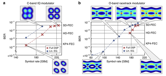 研究人员对另两种调制器进行数据传输实验(图6):相干测试C波段IQ调制器(图6a),正交幅度调制(4 QAM)格式下实现 224 GBd符号速率,(对应448 Gbit/s 线速率,为SiN平台及BTO基调制器最高记录)。以 IM/DD 架构测试O波段RT调制器(图6b),2 PAM格式下达200 GBd符号速率,片上损耗< 2 dB。相较同类调制技术,两款器件在不同波段、架构下均展现出高速率与DSP兼容性优势,印证平台对多种距离通信场景的全适配能力。