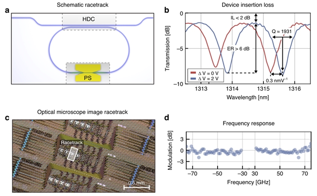 该平台的调控能力可覆盖 1260-1360 nm(O 波段)与 1530-1565 nm(C 波段)双光谱窗口。研究人员设计了三款针对不同应用场景的调制器:C 波段马赫-曾德尔(MZM)调制器、C 波段同相正交(IQ)调制器及 O 波段跑道微环(RT)调制器(图1d-1f),三款器件均采用同一工艺实现单片集成,为后续多波段、高速率调制性能验证奠定了结构基础。
