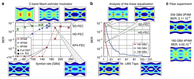 研究人员通过多调制格式传输实验(图5)证明:二进制脉冲幅度调制(2 PAM)格式下符号速率达256 GBd,4 PAM达170 GBd,8 PAM 达96 GBd(图5a)。前馈均衡器(FFE)抽头数分析表明,140 GBd仅需10个抽头,160 GBd用21个抽头即可满足KP4-FEC要求(图5b)。400 m光纤传输实验中,2 PAM 256 GBd与4 PAM 160 GBd的误码率均低于纠错前误码率(SD-FEC)阈值,眼图性能仅轻微下降(图5c)。