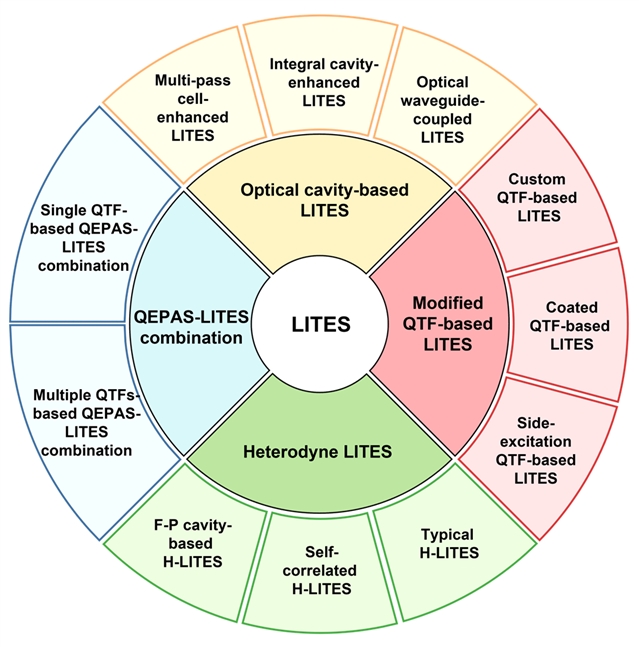 在环境监测、工业过程控制、医疗诊断以及安全报警中,对气体成分进行高灵敏度、高选择性测量是一项核心技术挑战。传统电化学与半导体气体传感器虽成本较低、易于集成,但普遍存在灵敏度不足、选择性差和易受环境干扰等问题。相比之下,激光光谱气体传感技术凭借其特有的“分子指纹”识别能力,成为高灵敏度痕量气体测量的重要方法。2002年,石英增强光声光谱(Quartz-Enhanced Photoacoustic Spectroscopy, QEPAS)技术被提出,创新性地以石英音叉(Quartz Tuning Fork, QTF)取代传统麦克风作为声波探测元件,凭借其高品质因数和优异的频率选择性,提升了传感器的灵敏度和噪声抑制能力。2018年,利用石英音叉的热敏特性,进一步提出了光致热弹性光谱(Light-Induced Thermoelastic Spectroscopy, LITES),实现了非接触式的测量。以石英音叉为核心的这两种技术,不仅具备超高灵敏度与稳定性,更展现出强大的微型化与低功耗潜力,迅速成为痕量气体传感领域的研究热点。