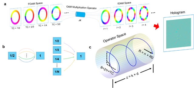 图2. 算符选择性全息图。a. 在OAM通道中叠加修正相位,b. 仅有特定的算符路径可以重建目标图像。c. 同一整数OAM通道可细分为多个算符子通道,作为独立的信息载体。