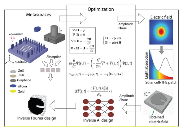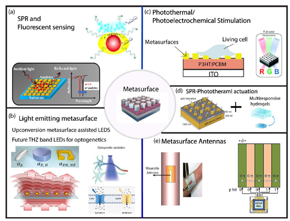 目前大多数医疗植入物都依赖导线激活电信号,导致治疗具有侵入性,且在精度上会存在一定的限制。但是,光刺激可以解决这些问题,尤其是超表面的波前可调控性为光刺激的实现开辟了新的可能。在生物电子平台中,可以结合超表面的电磁场调控与生物系统中的需求,来选择性的实现光吸收增强、电场定位及波前控制。还可通过设置不同的应用波长、超表面的几何结构、材料成分等,实现最大的电磁耦合,如:在可见光范围内,与光伏或有机半导体集成的超表面可增强用于神经或心脏接口的光电子刺激。在太赫兹频率下,超表面通过光热或声子驱动机制,可实现无标记组织成像、热调制和局部药物释放。
