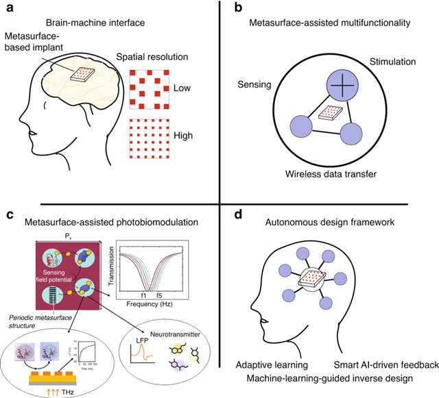 最后,通过图4详细的展示了生物电子学未来可开发的研究方向,包括超表面赋能光传输的皮质植入物;集成传感、刺激和调制的多功能超表面平台;超表面辅助的精准生物调节技术;自主人工智能驱动的超表面设计框架等。