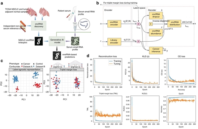图3:基于致癌 RNA(oncRNA)的液体活检平台及Orion架构:a.基于癌症基因组图谱(TCGA)组织数据集与非癌症对照样本的非小细胞肺癌(NSCLC)致癌RNA(oncRNA)验证图;b. Orion模型架构所需的两个输入计数矩阵示意图;c.三元组边际损失在模拟数据上的应用示意图;d.损失收敛曲线图